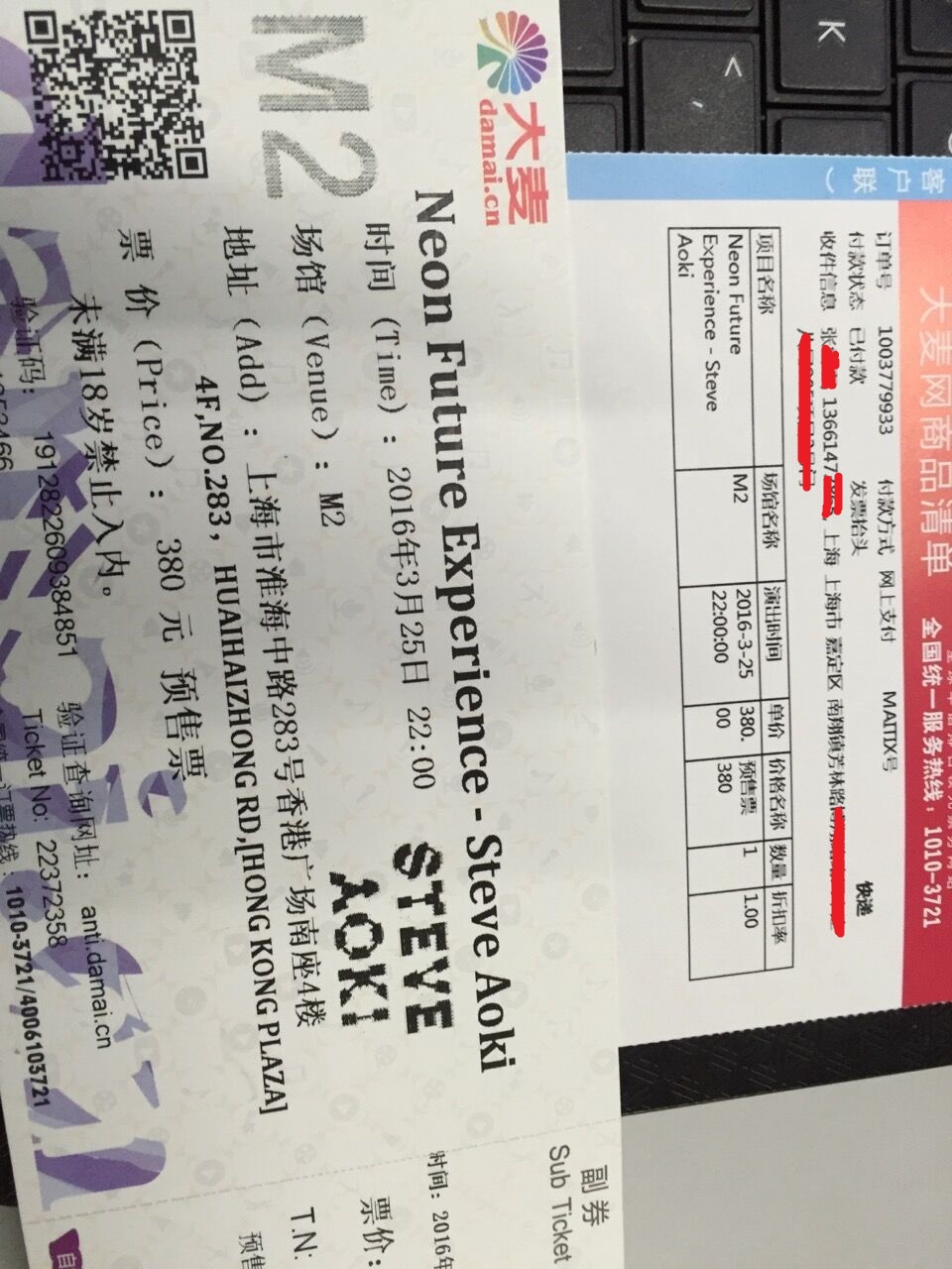 转steve aoki 上海3.25M2门票