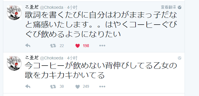 こゑだ :每到写歌词的时候,就深切的感受到自己是个任性的孩子呢。。好像快快咕噜咕噜地喝咖啡