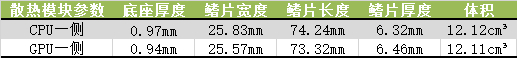 PS:该结果仅供参考,由于鳍片不规则以及铜管位置导致计算偏差,实际大小会有所出入。此外,鳍片的多少并不能决定最终机器的散热好坏,它只是一个决定因素,此外还有风扇规格(风量、转速设定),进风口面积,出风口形式(吹屏轴),铜管参数(长度、形状、直径和数量)及硅脂导热效率等因素。