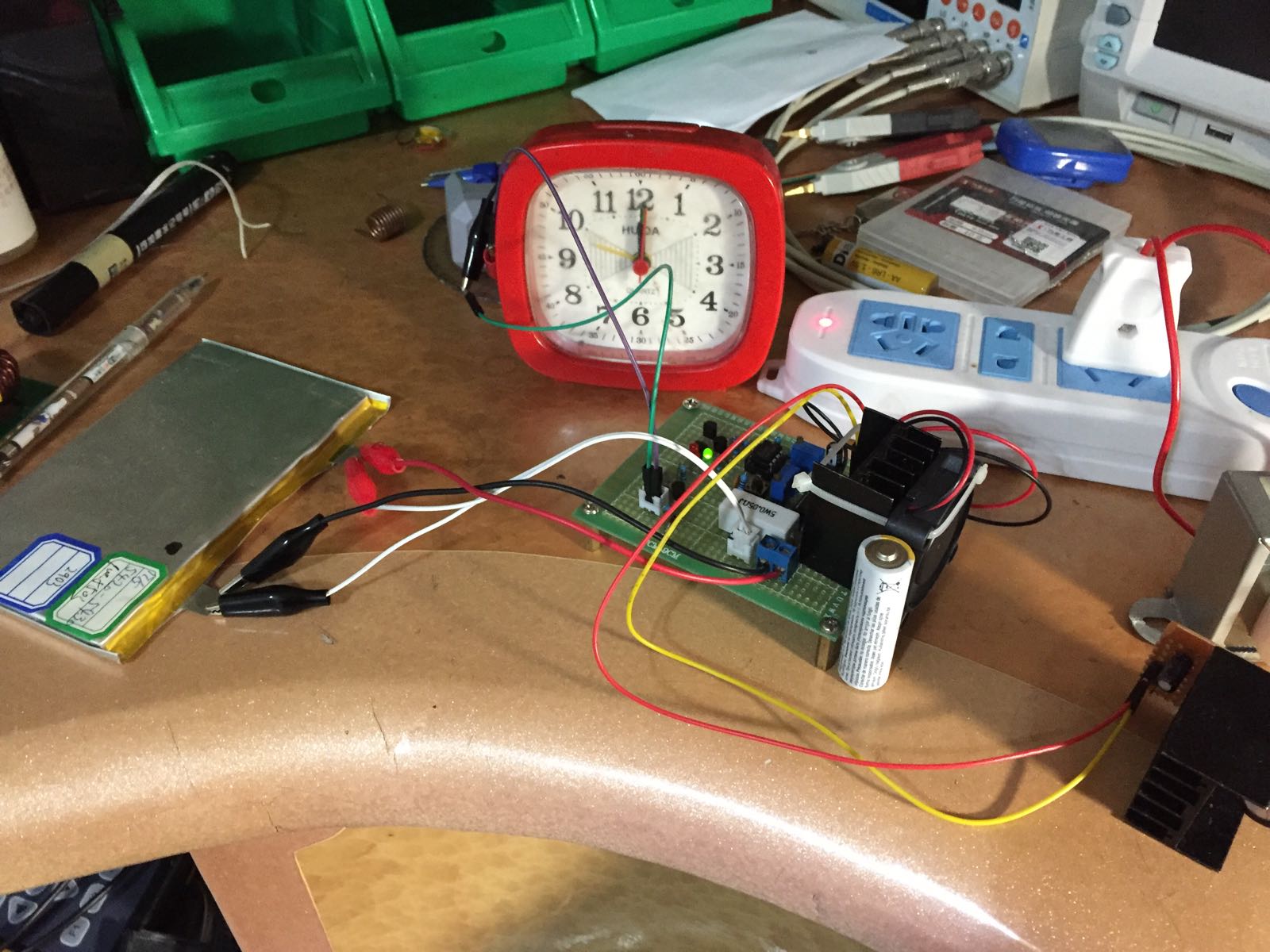 上面那个电位器可以调整电流,下面的调整放电终止电压。设置好电流电压之后,接上闹钟电池,就可以测试容量了