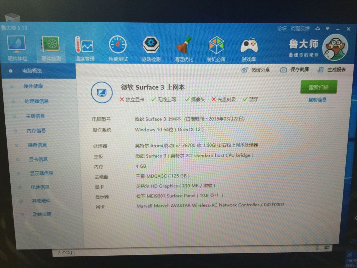 RT,小白入手了一个二手surface3,3200配笔一支,外观几乎没有伤痕,用鲁大师检测如下。请教大虾们,这台机器的状况怎么样?到手之后我还应该检查什么地方吗?