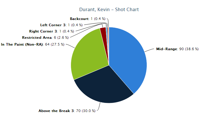 杜兰特真的说过这句话,虽然他之后所说的并不合数据专家们的胃口,身为球员的他更相信比赛中的记忆——换言之,他不在乎三分和中距离哪个更有得分效率。他会让射程遍布整个三分线内——他做得非常出色,也非常有效率——他本赛季投了428个三分球,而且只有23个底角三分,而且更有意思的是,理论上最有难度的弧顶反而是他最热衷的出手热区。