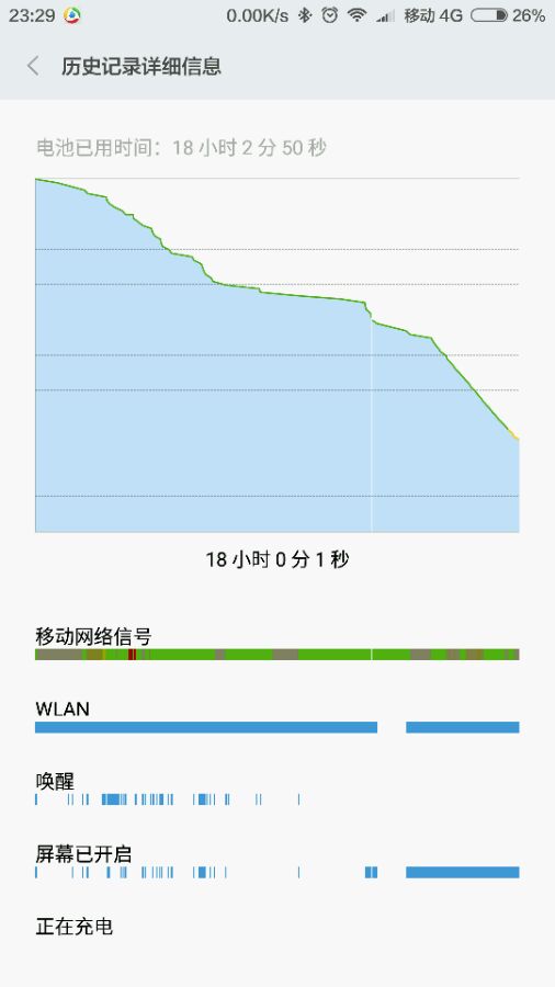楼主家里或宿舍信号非常不稳定,所处位置不会是市中心之类,甚至有的地方就没有信号,这一天基本没出去过只有下午出去过一次,楼主5:30闹钟起床,起床后比较忙,白天不怎么用手机但晚上用的还是挺多的而且睡觉很晚。