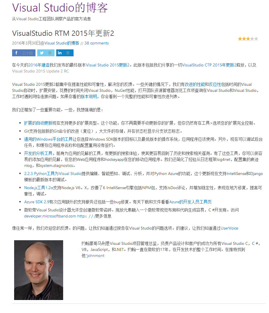 本次VS2015带来update2的更新,我们来看一下update更新内容:
