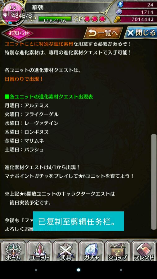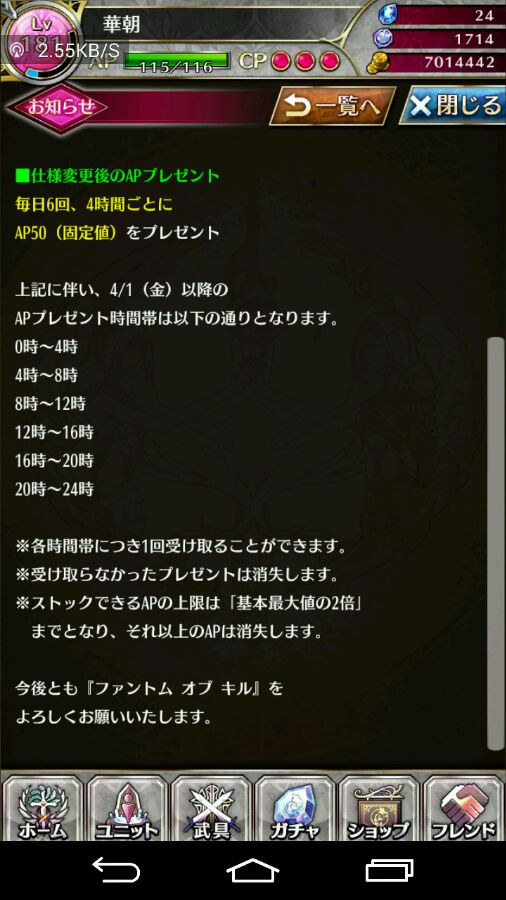 1、先说下免费AP领取改动吧,从今天开始,日本时间0时(北京时间23时)开始,每4个小时能领一次50AP,共300AP,反正我比以前能领的免费AP少了。