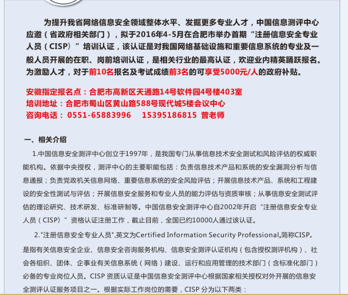 6. 不满足注册信息安全专业人员(CISP)工作经验要求的人员,也可以先参加注册信息安全专业人员(CISP)培训和考试,在完成培训并通过考试后,获得注册信息安全专业人员(CISP)培训结业证书;在获得注册