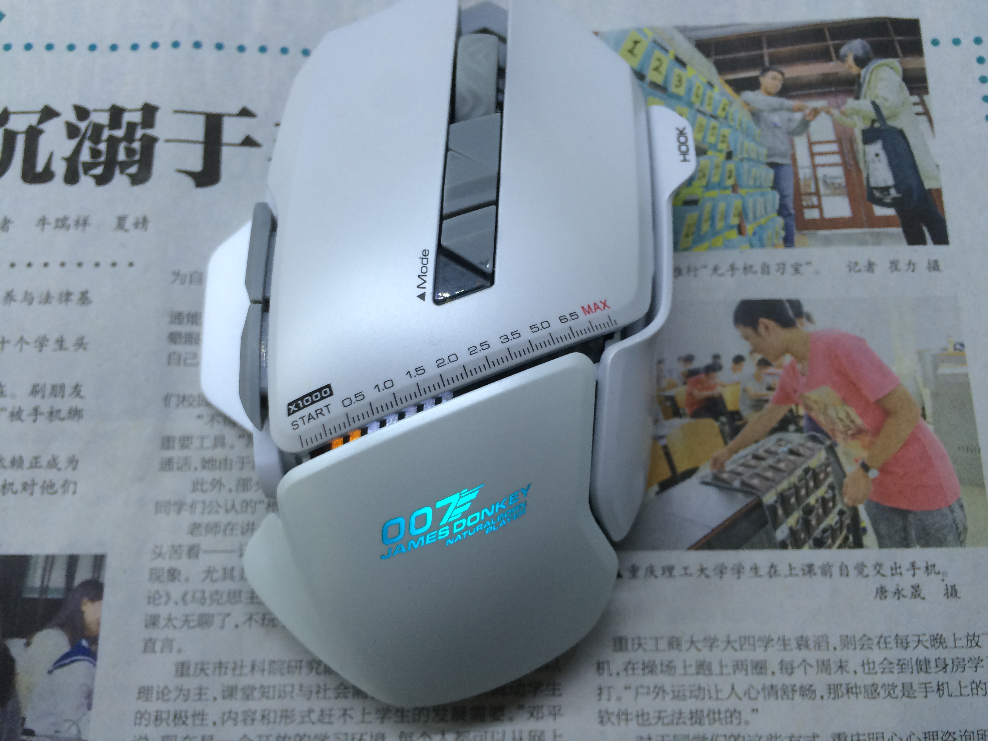 鼠标的左右按键很清脆,鼠标的滚轮很柔软,摸起来很舒服,滑动起来也不吃力,也没有异响,滚轮下有两个按键,第一个是切换模式的,鼠标能储存多个模式,不同模式可以设置不同的属性,dpi,灯光,宏之类的,下面讲驱动的时候还会介绍。第二个按键是调节dpi的,有5个dpi选项,按下循环改变,也可以在驱动中设置。在下面的三角形区域不是按键,是可发光的6个点,是提示你使用的模式,不同的模式点亮的光点数量不同,这个功能很贴心。
