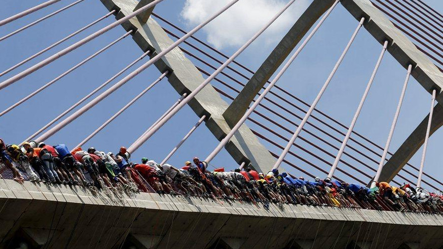 当地时间4月10日,巴西荷托兰迪亚市,149名蹦极爱好者从当地的一座30米高的大桥上集体跳下,创造了集体蹦极的世界纪录。