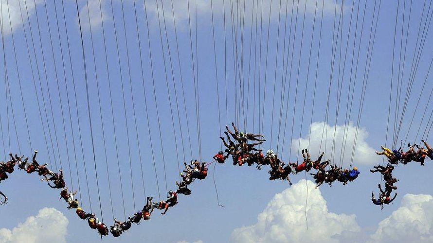 149名蹦极爱好者从30米高桥上跃下瞬间。这项运动的全部保护措施就是一条尼龙绳,并且与传统蹦极不同的是这些尼龙绳是没有弹性的。所以这些挑战者在下跳到最低点时不会反弹来减缓冲力,而是会来回悠荡起来。