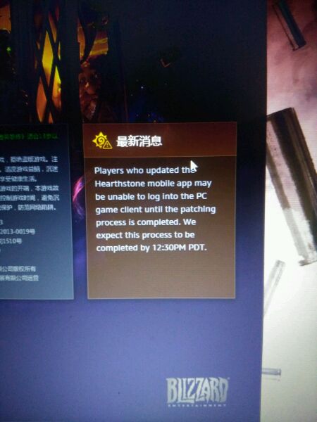 更新了炉石传说手机端app的玩家可能在布丁完成之前不能够登录到PC客户端 我们期望这个过程能在北京时间凌晨三点半之前完成(他给的是太平洋夏季时间)