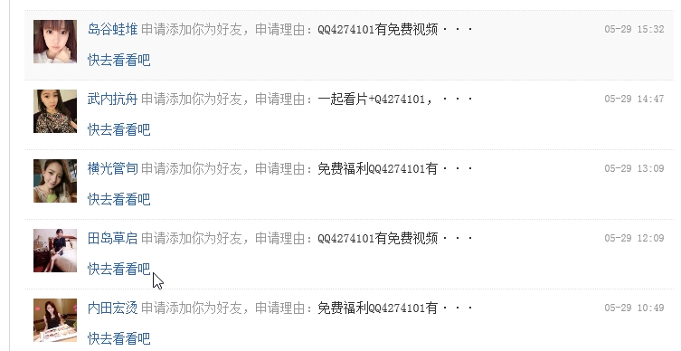 经常收到这些好友申请,或者突然一夜之间受到了这些讨厌号码的关注,我只想问度娘,这些申请或关注,能否设置可以让我们自行删除或者加入黑名单或者屏蔽的功能?实在是太令人讨厌和反感了,都是些乱七八糟的贴吧号,度娘怎么也能通过这些垃圾的申请?强烈要求设立我们可以自行将这些垃圾号删除或者加入黑名单或者屏蔽的有关功能!!!以净化网路环境,净化百度帖吧。