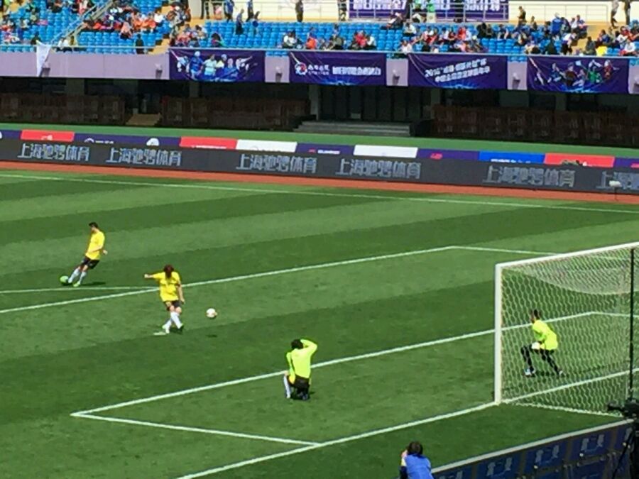 开场前的热身,没想到正好在靠近我的位子。看他练抢点射门和点球,力度欠缺,倒是准星不错。其他的香港明星也就认出陈百祥,罗家英,黄日华。对方球队倒是我还认得好几个,身材都保持得很好,人高马大,根本不在一个档次。