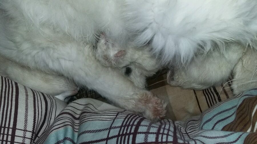 母猫发情太恐怖了!根本不能放在家里!要不然晚上是别想睡觉了!第一次发情,周围养猫的很少,跟我女儿一样的也没有!没办法只能放出去自己解决!不过幸运的第一次没配上。当时真想给她去绝育,结果第二次发情配上了!肚子一天比一天大!后来就是今天出生了!还非要在我被子里生,结果没办法只能让给她了!还不能给她挪窝,要不就叼着小猫回来!哎!我的小冤家啊!……………………