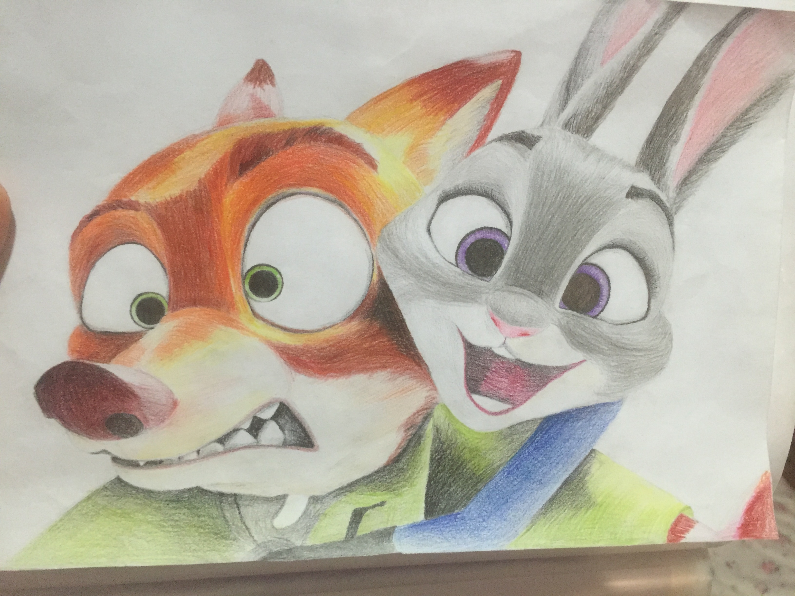 我是一个学生。。。六年级。。。最近看了ZOOTOPIA以后迷上了这部电影,心血来潮的画了两张彩铅。没用画板,有问题可以说,什么都行。。。求指点。另,我是一个高冷的手残(万年潜水),不太爱说话。。。有怠慢请原谅!