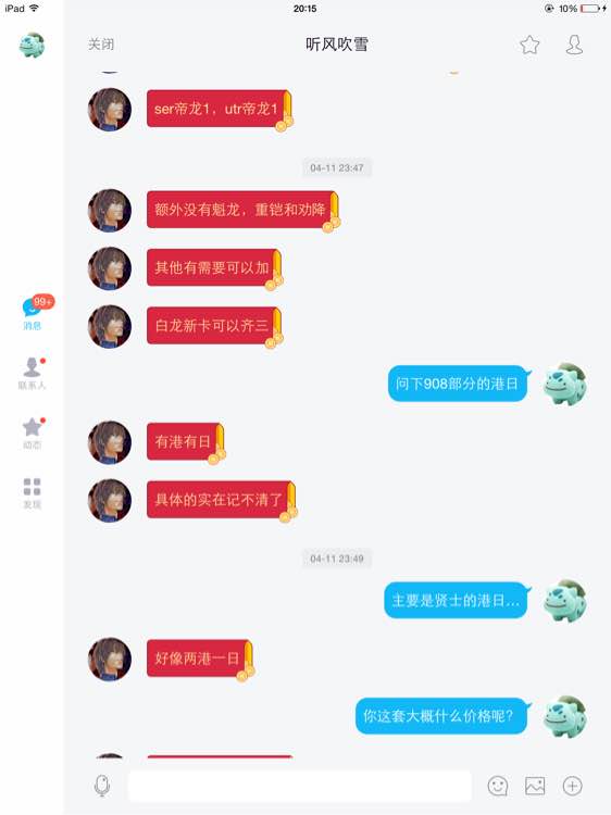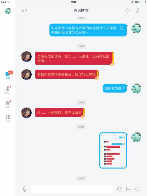 事情大概就是我用OH(神蚀创痕)的一些散卡跟这人交换一套不全的白龙,然后就出现了少灵庙的问题,我追问为何少东西这人也是3天不回复,我本来都当作被骗了想算了的,这人又找上来了,这时候就好玩,我之前是一堆东西套出,他要散,我也就散了,然后以散的价格给他了,过了几天,这人又找我要之前不要的部件,还非要按照原来整套的价格扣除上次散的价格来收,我就乐了,我说那你去M记买套餐不要可乐之后再单点可乐,还能要套餐价的可乐?然后我表示想先解决龙庙的问题,毕竟龙庙也算值点钱,然后他表示可以退我5块(滑稽),也不愿意包邮给我把缺的龙庙发过来,这就非常尴尬了,既然谈不拢就只能用我能接受的方式解决了,于是我决定挂他。