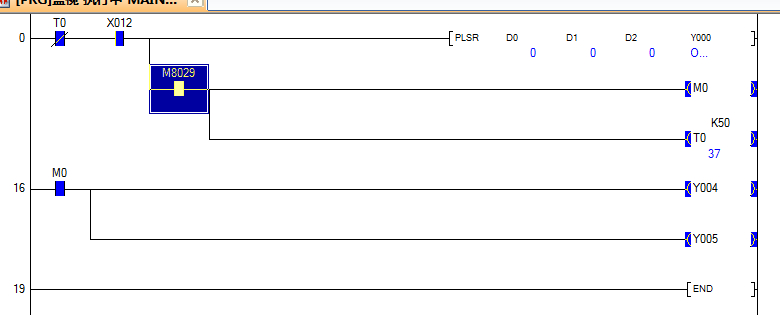 如下图;我在程序里编了个计时器T0就想让脉冲输出过后马上输出Y4和Y5,等5秒过后就停止Y4,Y5输出,但是脉冲输出后Y4,Y5就一直输出,并没有按照我想像的会停止输出,问题出在哪里啊,请指教。谢谢