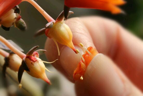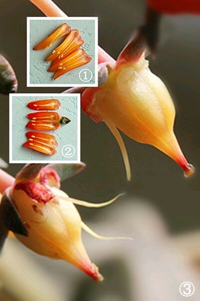 2、把需要授粉的另外一株多肉植物的花叶把雄蕊拔掉,要注意不要碰到雌蕊,然后用刚才拔掉的另外一株多肉植物的花的雄蕊去XXOO~现在这株的雌蕊,可以多授粉几次,这样成功率高。
