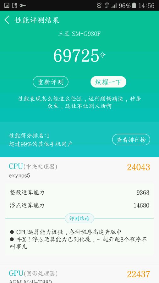 刚才S7升级后跑分第一了!!