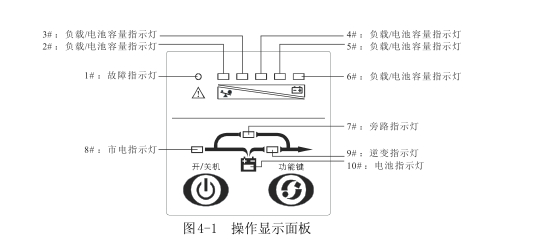 你好,左边是负载指示灯,右边上是旁路,下是电池,右是逆变,左是市电,有问题可以找我,