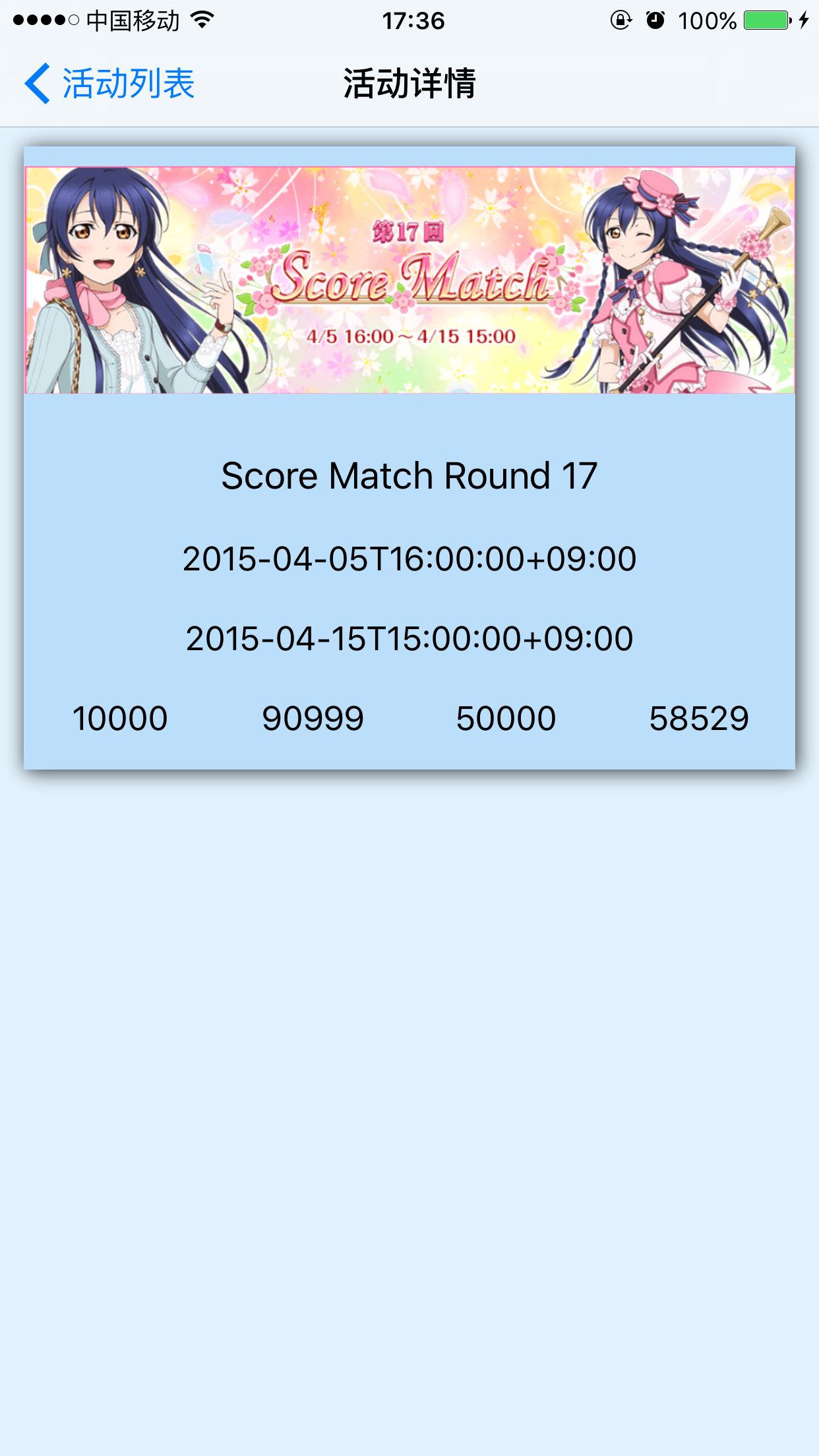 イベント結果 10000位=90999pt 50000位=58529pt