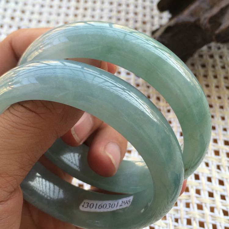 糯冰种浅油青翡翠手镯,肉质细腻,完美无瑕,三围:58.2/16.3/8.5,58.3/15.5/8.6,一对价:9000