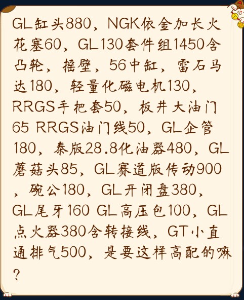 回复 乐景_哀情 :加大缸头500 凸轮6.8的角度100 59MTRT加厚风冷缸熔断活塞360 大压缩!扇形300条tpwo曲轴480 泰版30化油器300 GL传动一套580 TWPO大扭油油门线歧管200有多 怎么就不能56全套了? 59全套