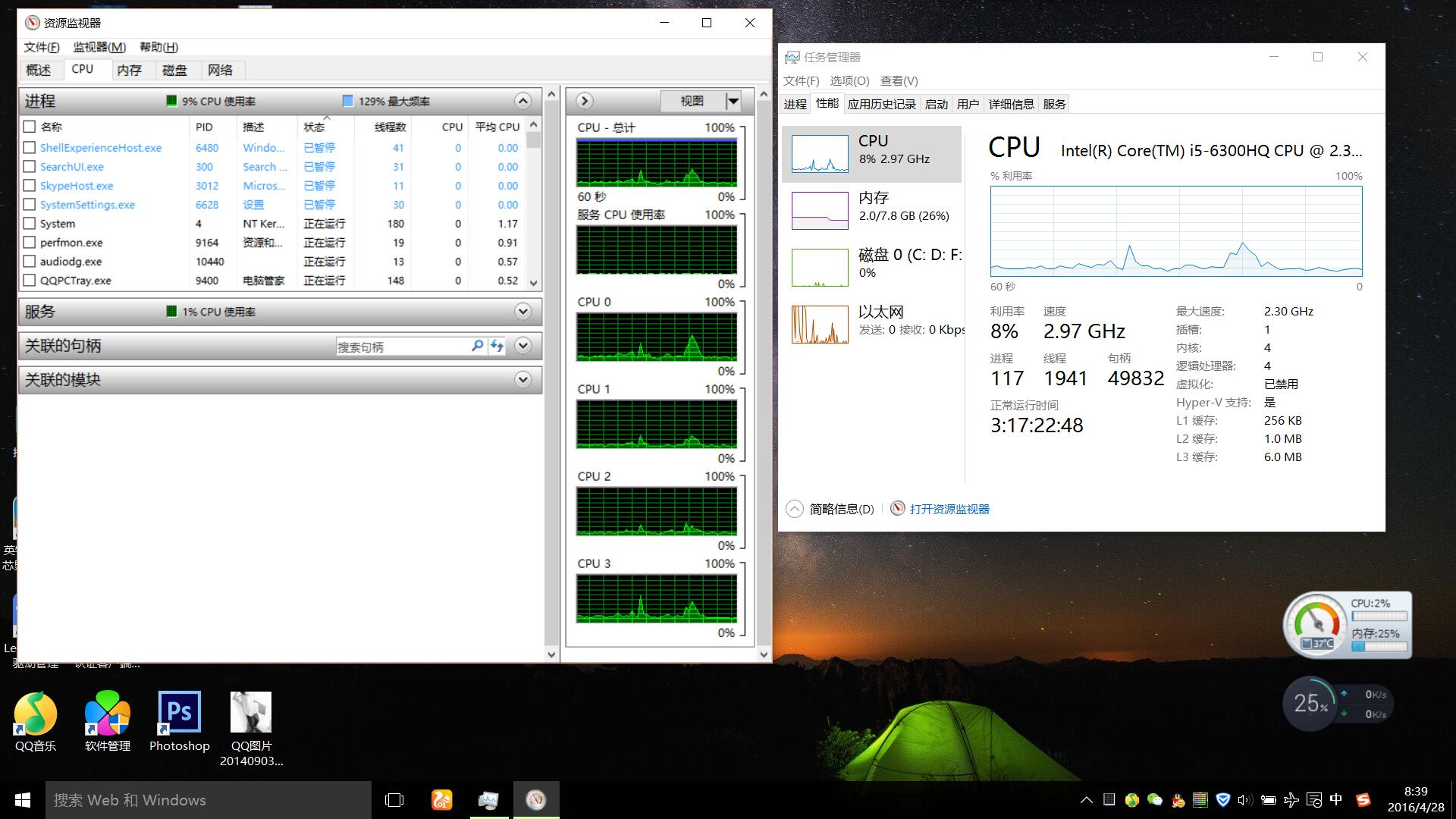 本身乞丐版,加装了内存条共8g,开了扣扣,微信,听音乐来测试,可以看出加内存是必要的。