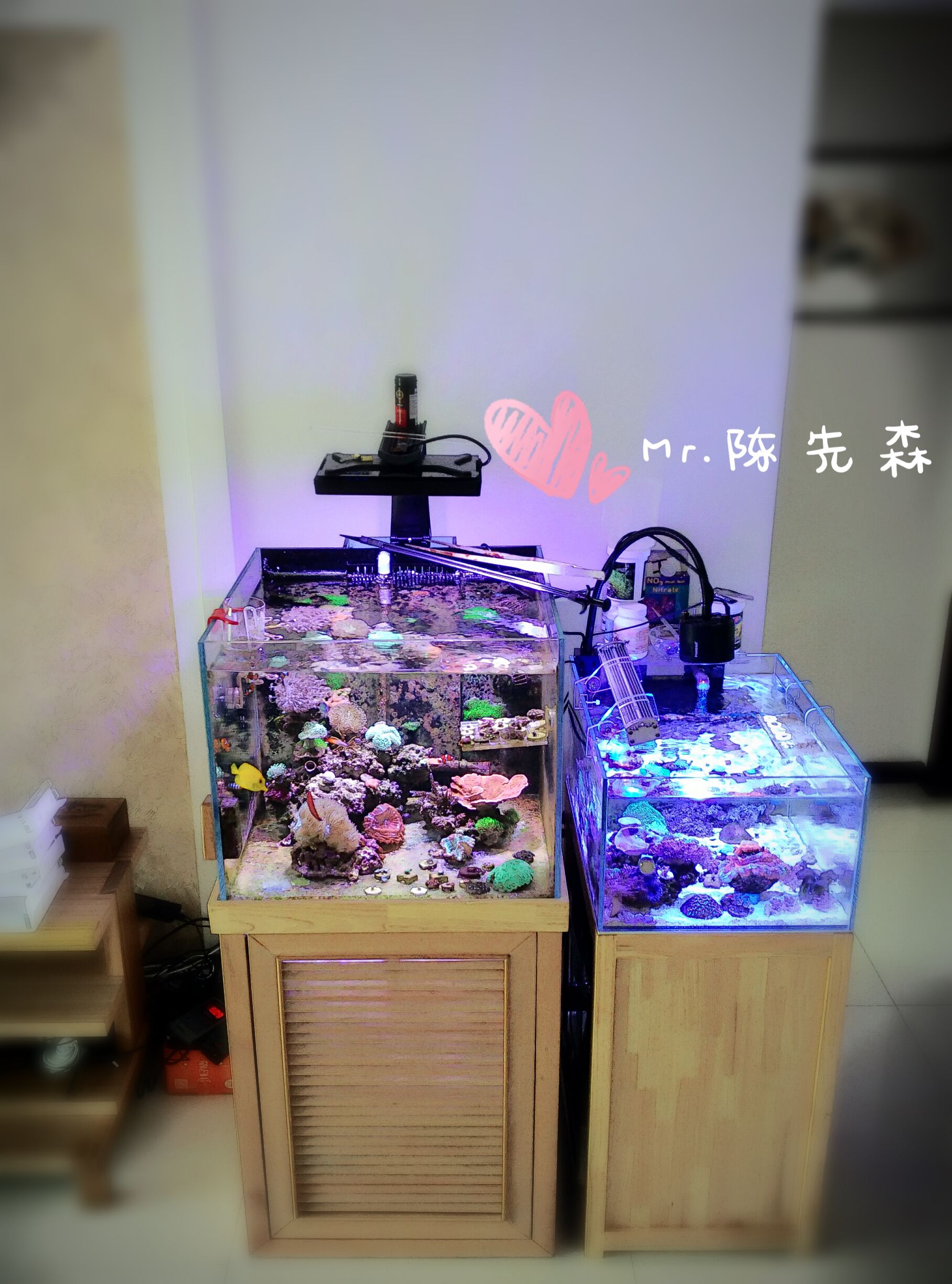 添加剂:TM,ZEO,Brightwell,FM,某科技的轮虫,还有台湾那个啥OMG1+轮虫+牡蛎卵+鱼子酱一套得来着?(忘了后面图片有),还有两只小鱼AB液,一些烂七八糟的。两年添剂花的钱够当初一套设备的钱了。