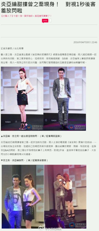 炎亞綸30日晚間摟著曾之喬一起參加時尚活動,兩人主演的電視劇《後菜鳥》累積大批粉絲,一出場就成為注目焦點,他還自己加碼把西裝外套脫掉,露出結實的臂膀、肩線,特別的是,在接受Q&A訪問前,曾之喬似乎發現他的鼻子上有東西,對視1秒後,直接伸手幫他拍拍鼻子,大放閃光的小舉動讓現場惊叫连连。