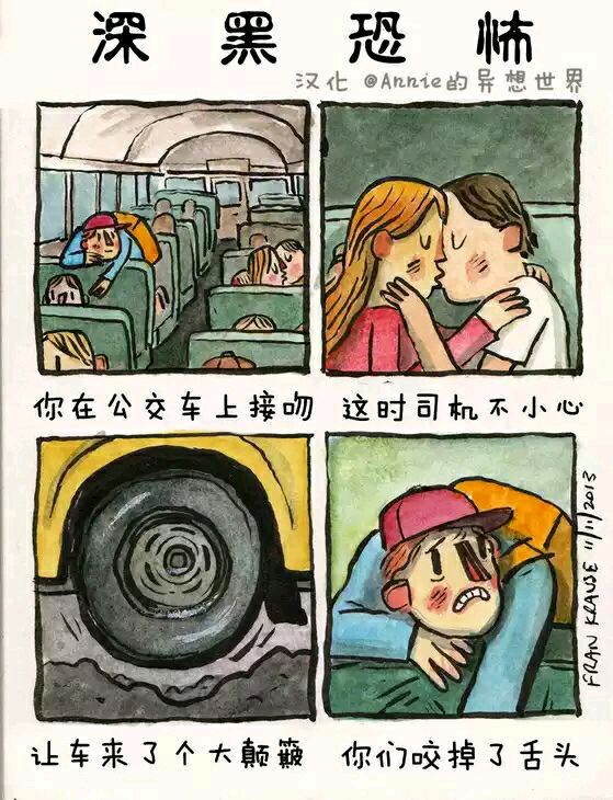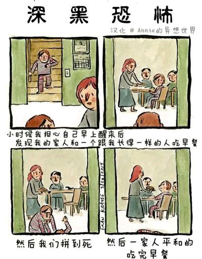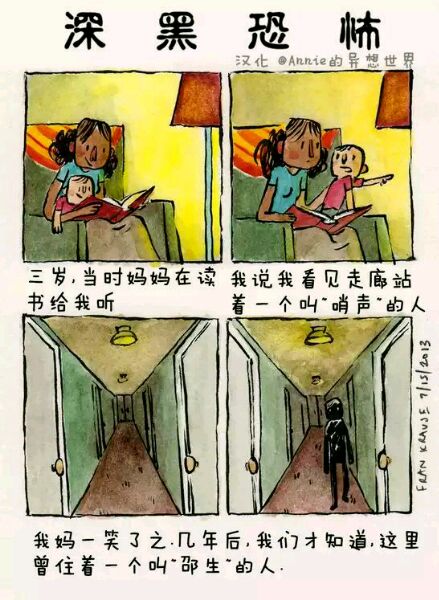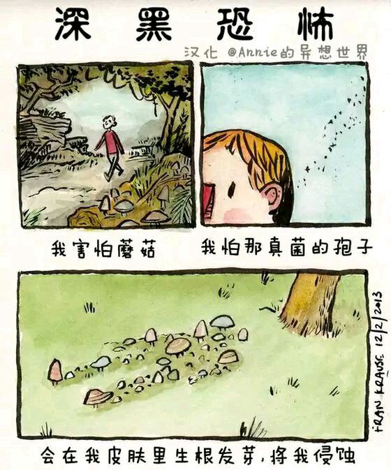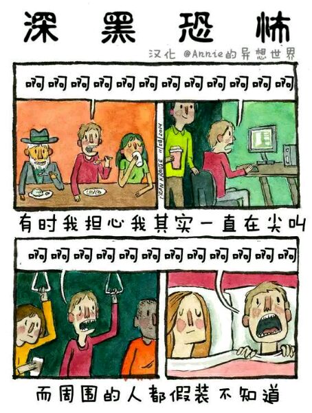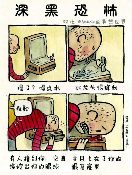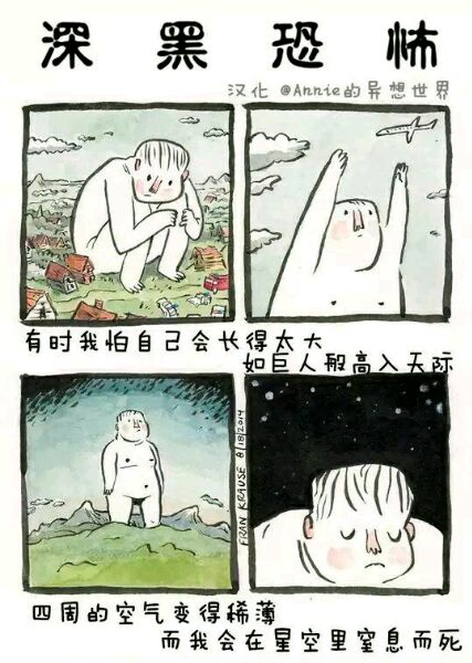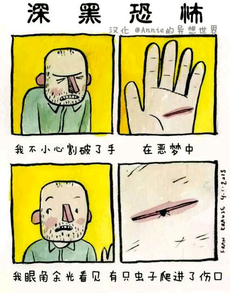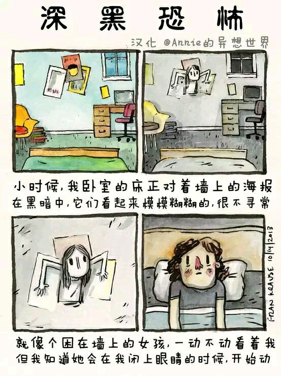 Deep Dark Fears 是艺术家Fran Krause的经典连载小漫画,讲述人内心最深的恐惧,这恐惧也许来源于小时候的幻想,或是长大后的焦虑。漫画格式为两格或四格不等,短小精湛。颜色及语言运用巧妙的抓住读者的注意力。随着阅读,恐惧渗透人心,勾起我们内心深处的恐惧,引起共鸣。