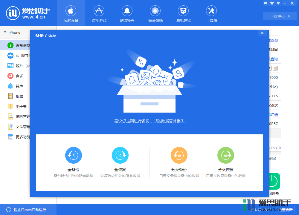 爱思助手备份功能分为“全备份/全恢复”和“分类备份/分类恢复”,您可以根据自己需要选择对应的功能。连接设备之后可以在设备信息中看到“备份/恢复”功能,或者在上方工具箱中找到此功能。