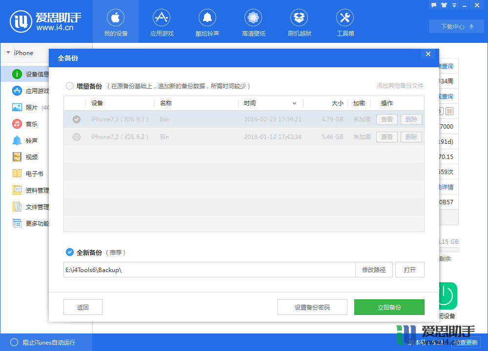 可以全新备份资料,如果你已经备份过资料的话可以选择增量备份以节约您的备份时间。