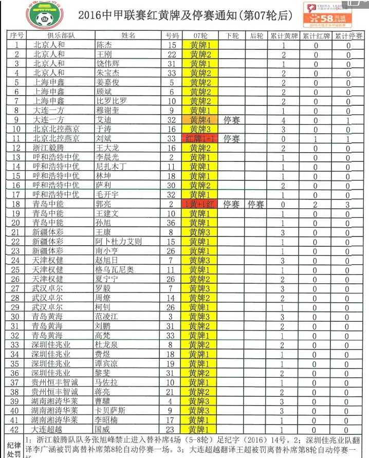 2016中甲联赛七轮过后的红黄牌及停赛通知