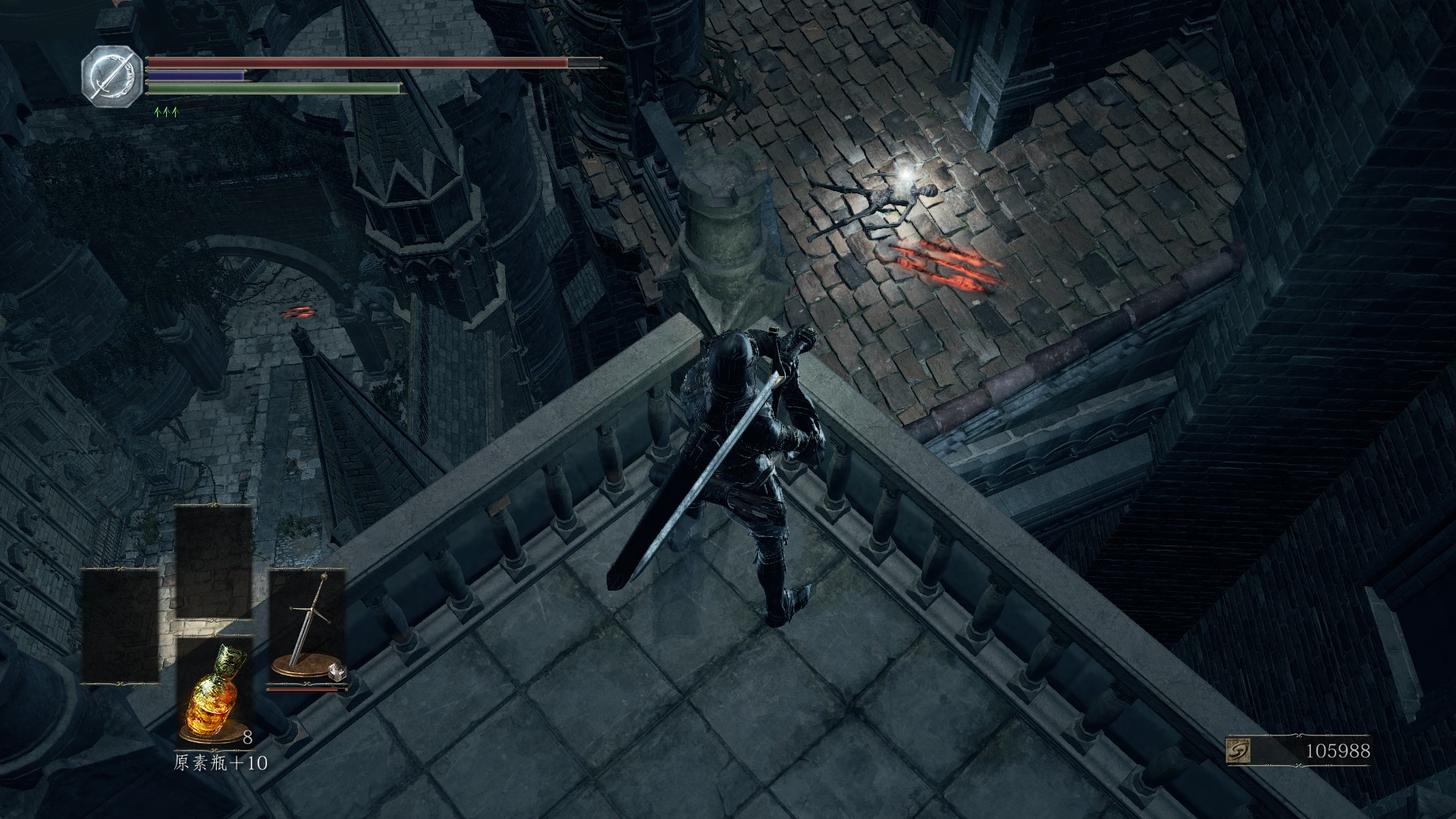 从遇到石像鬼那个地方,下面平台有几只鸦人的,跳下去往前走就是了,不是什么好东西,好像是龙鳞楔形石