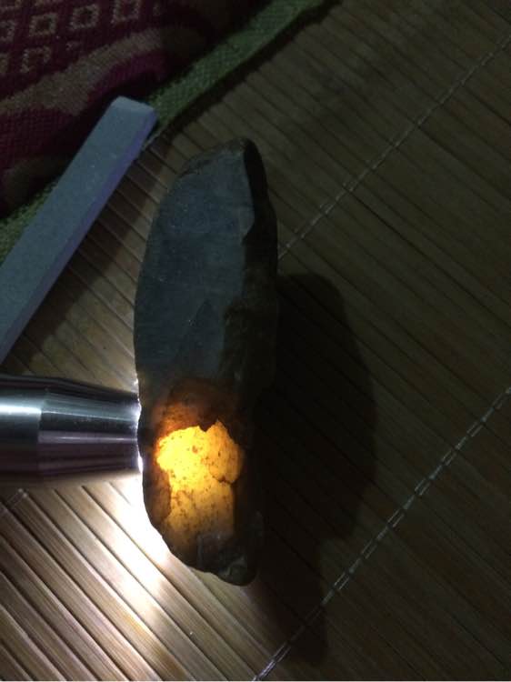 看到他这么容易就切出翡翠,我也兴起要切一块………每一块石头我都拿起来用电筒照,外面白沙的,黑色的,水泥皮的……