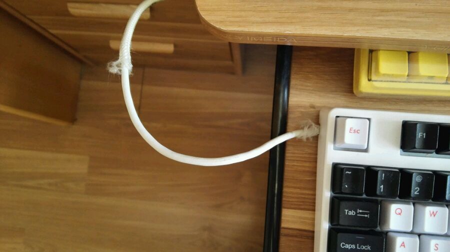 问题有2个:1,换了鸭子原装ABS键帽。2,如图所示线的外包毛线断了一块。
