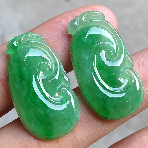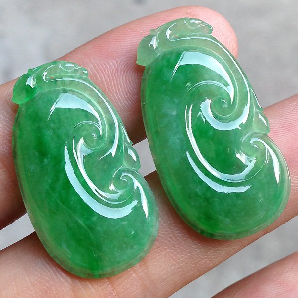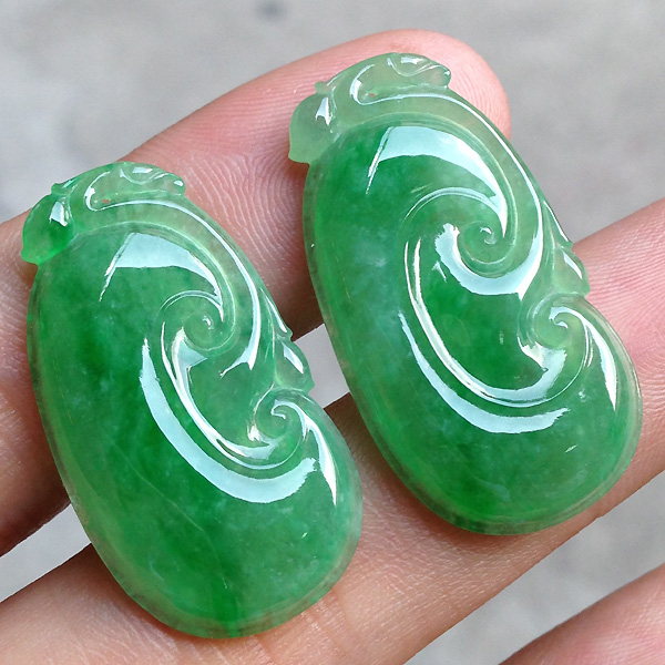 一对绿色如意,种水不错,好看。尺寸:33、18、3.7/31.5、17.4、3.7MM。价秒一对:6980 【05064866】