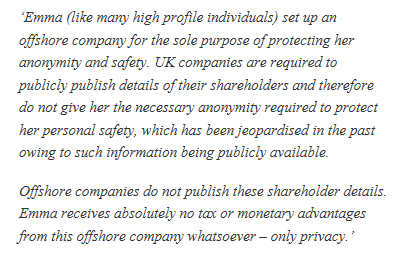日前发表的某知名文件名单上,艾玛·沃森赫然上榜。上面标明,她在英国维京群岛设有投资公司,并因此用280万英镑在伦敦买下一处豪宅。屈臣氏的发言人就此发表声明,声称沃森此举是为了保护个人隐私,而不涉及税务问题。"
