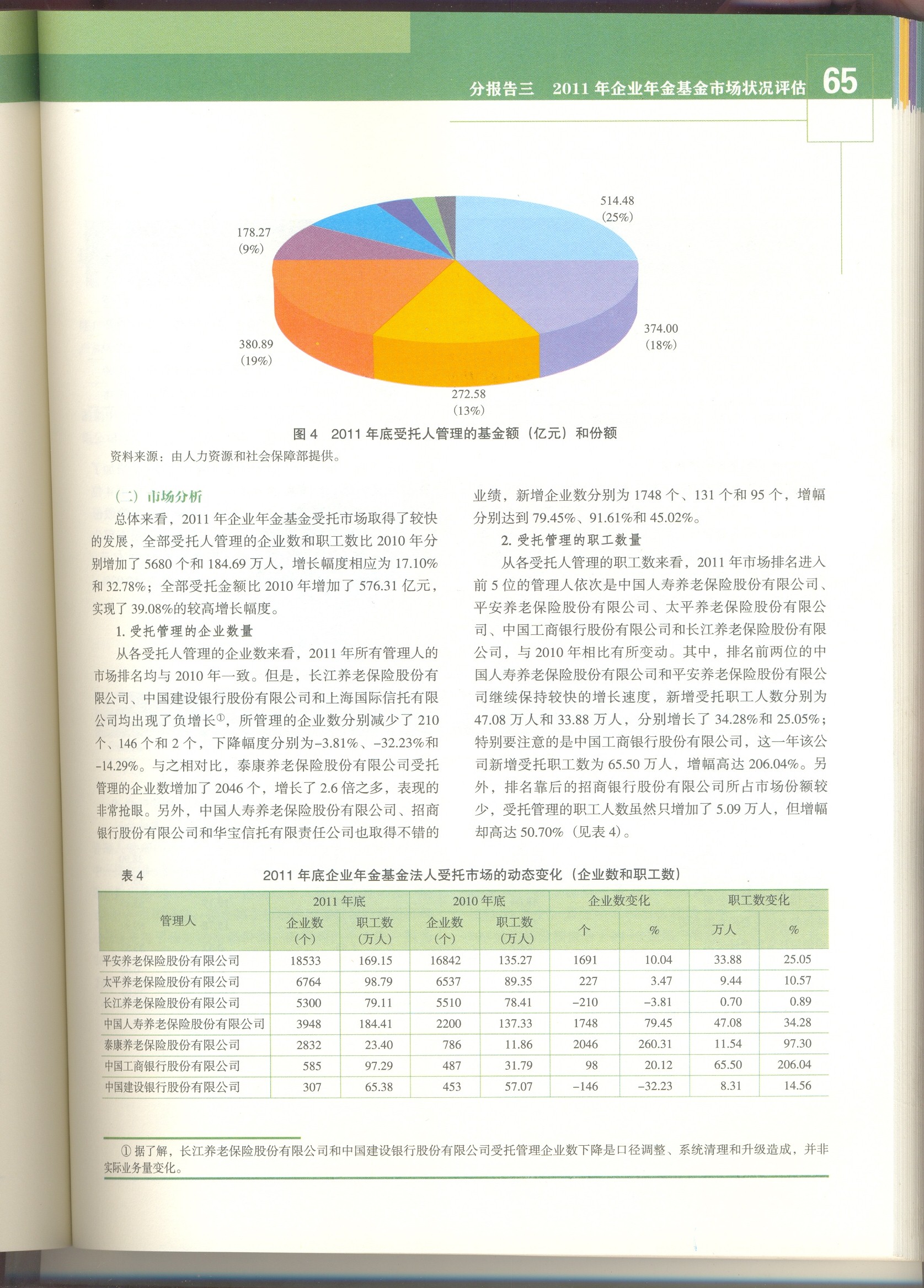 而现有官方公布的数据却有明显差别。2012年6月4日,中国人力资源与社会保障部向社会公布了2011年度人力资源和社会保障事业发展统计公报。此公报是透视中国人力资源与社会保障工作成绩的重要窗口,也是解析社会保险最权威的数据来源。统计公报显示,截至2011年末,全国基本养老保险基金累计结余1.9497万亿元,全年城镇基本养老保险基金总收入1.6895万亿元,比上年增长25.9%,全年基金总支出1.2765万亿元,比上年增长20.9%。和2009年、2010年相比,城镇职工基本养老保险基金当期结余资金规模进一步扩大,已由2010年当期结余的2865亿元增加到4130亿元,增幅较大,这有利于缓解部分省市养老金支付压力。但有分析认为:基金征缴收入增长较快是其中一个重要原因。上述观点分别反映中国养老金现状的不同侧面和未来趋势的不确定性。