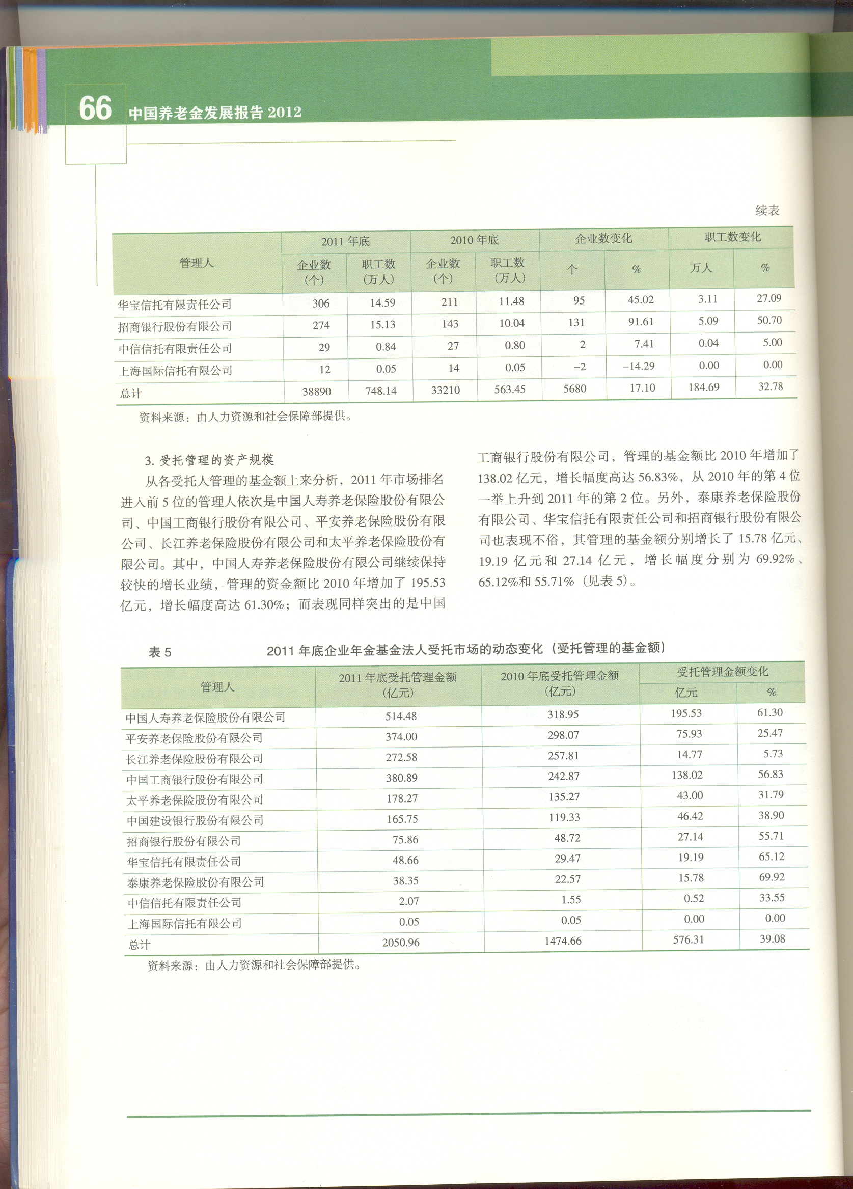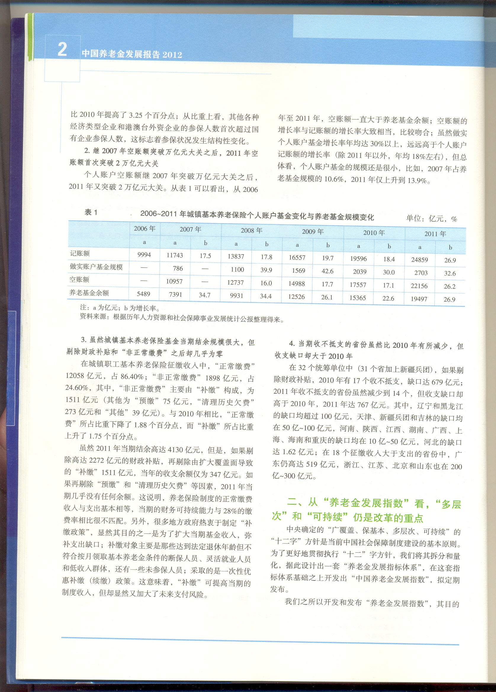 而现有官方公布的数据却有明显差别。2012年6月4日,中国人力资源与社会保障部向社会公布了2011年度人力资源和社会保障事业发展统计公报。此公报是透视中国人力资源与社会保障工作成绩的重要窗口,也是解析社会保险最权威的数据来源。统计公报显示,截至2011年末,全国基本养老保险基金累计结余1.9497万亿元,全年城镇基本养老保险基金总收入1.6895万亿元,比上年增长25.9%,全年基金总支出1.2765万亿元,比上年增长20.9%。和2009年、2010年相比,城镇职工基本养老保险基金当期结余资金规模进一步扩大,已由2010年当期结余的2865亿元增加到4130亿元,增幅较大,这有利于缓解部分省市养老金支付压力。但有分析认为:基金征缴收入增长较快是其中一个重要原因。上述观点分别反映中国养老金现状的不同侧面和未来趋势的不确定性。