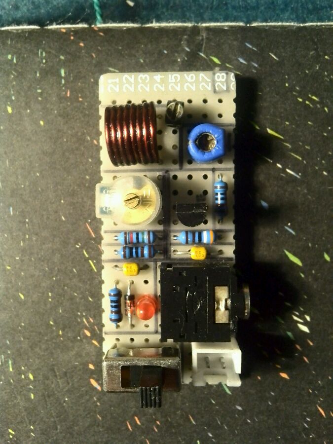 于是找来吧友音频调制的图,做了个小的连上,用手机放音乐进去,果然收音机中响出了洪亮的音乐,声音大且清晰,而且频率覆盖范围较广,稍稍一调就能找到