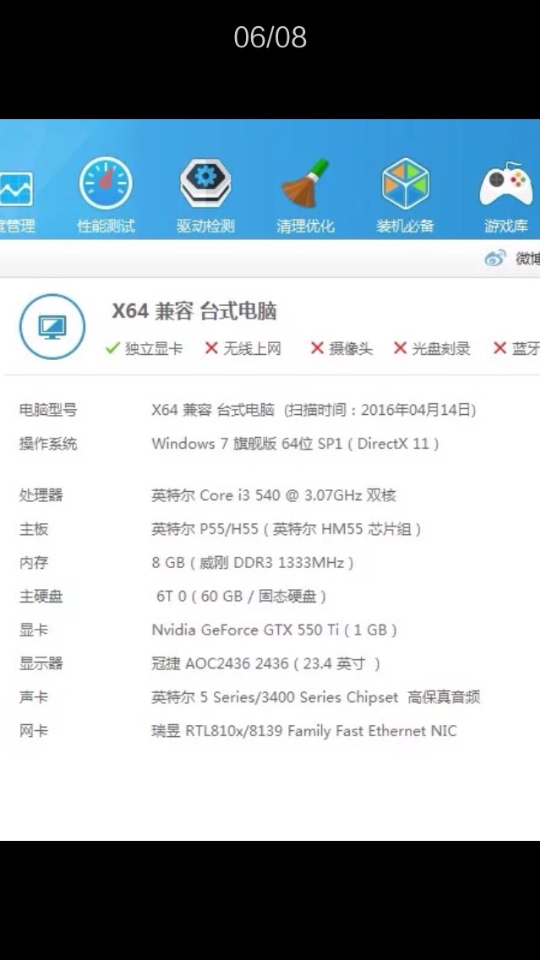 i3 540CPU 8g内存 独立显卡1g 双硬盘固态60g 机械80g 整机出不拆不换。 单主机 目前使用中 烤机两分钟一切正常。。。