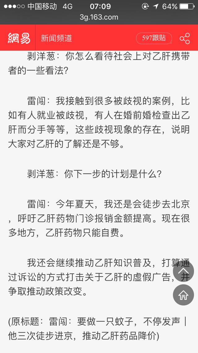 乙肝患者大多都迫于现实不敢发声,闯哥这样的我很佩服,同时也惭愧自己没有这样的勇气