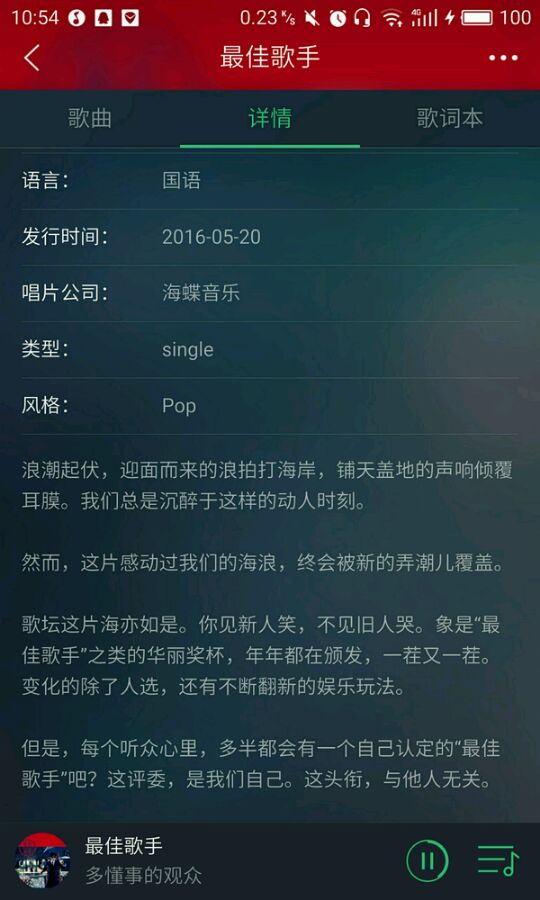 《最佳歌手》是一首难得的回忆录式情歌。感而不伤的唱法展现出了一个感性与理性交叠的许嵩。