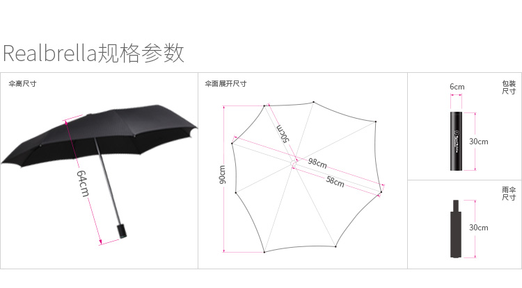 你一定有这样的尴尬:打着伞,依然被雨淋湿!有时肩膀、有时胳膊、有时皮包、有时...RealBrella,一把真正的雨伞。 全玻璃纤维伞骨,190T碰击布,仅重460g。 遮雨效果相同的伞比它重,同样重量的伞没有它遮雨效果好