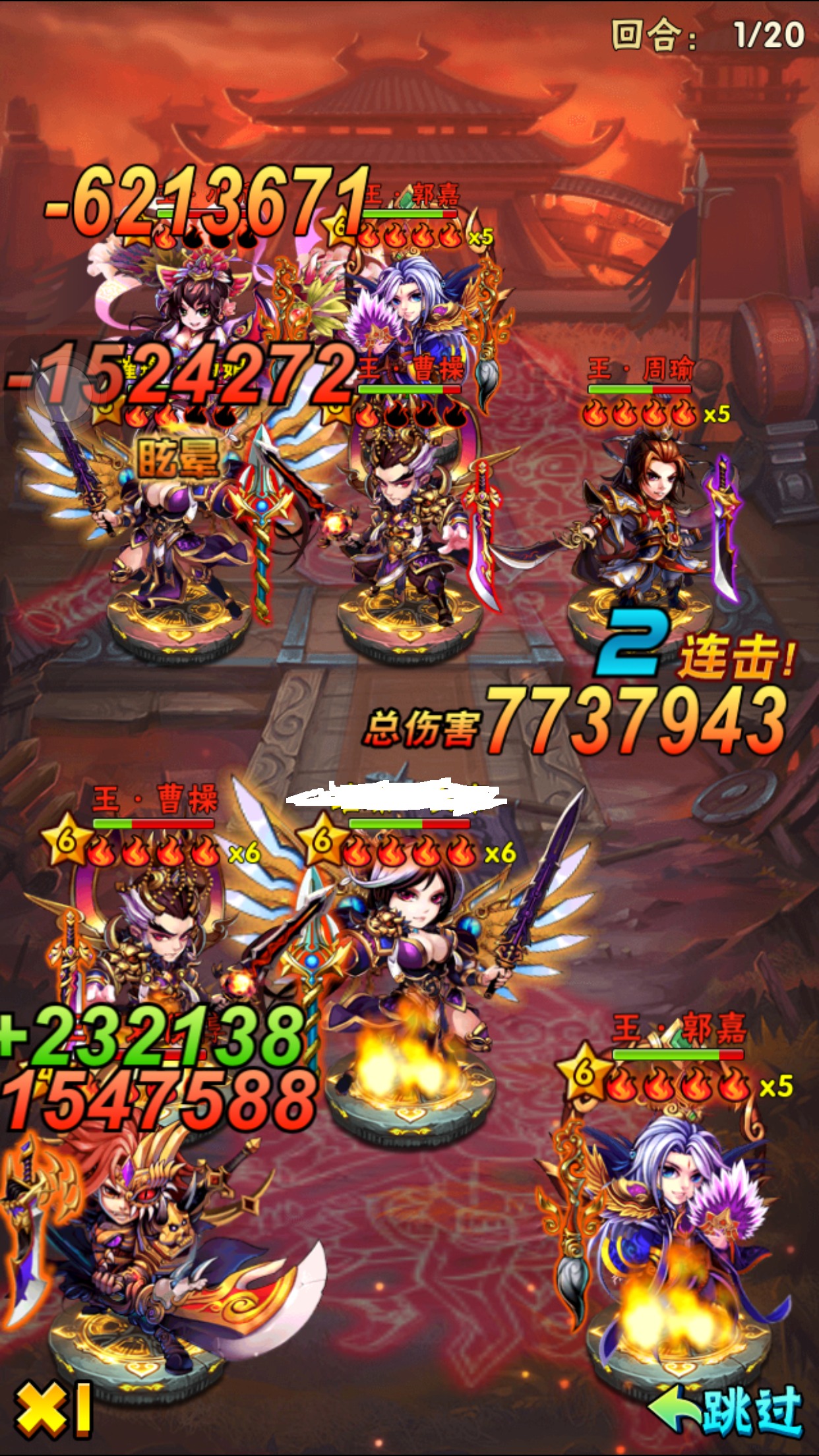 对方主角60W+的防御,由于后手曹操都被减怒有点坑,并未享受到60%残暴加成,伤害还不高。