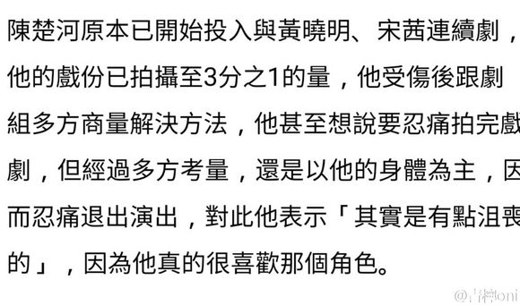 而事情的起因是因为下面这则报道,陈楚河在录制非凡搭档最后一站南京站跳集装箱项目时,因护膝脱落导致膝盖直接着地。最后诊断为十字韧带断裂,半月板严重受损,需要急回台北动手术,导致后续工作无法继续进行,遗憾退出了《上古情歌》剧组,损失千万台币。