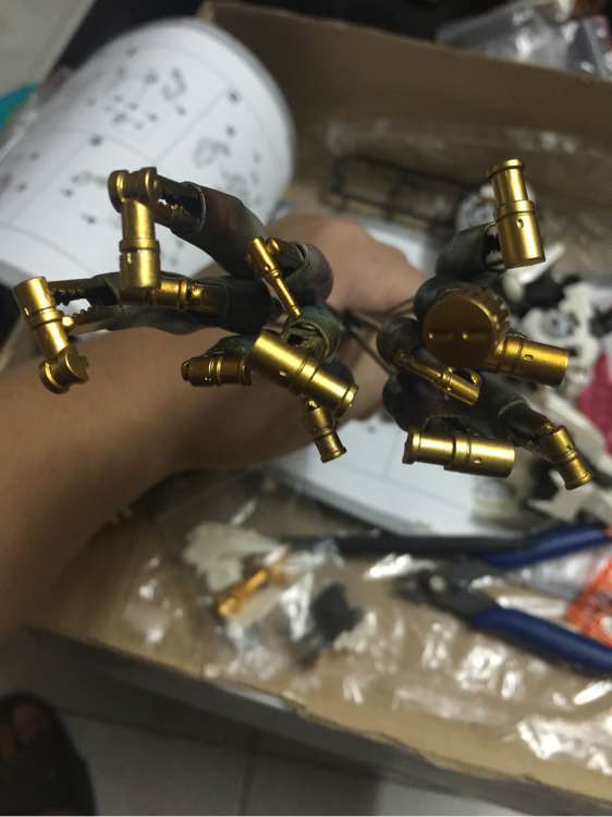 上周清了一个金虎,这周把珍藏更久的白狮也清了……本来想着素组就算了,但越看原色越觉得不爽,最后还是全部喷一次,外甲用了珍珠白,更接近原色,但更鲜艳!整体效果个人非常喜欢!手机比较渣,拍不出真实效果!现在就剩下两个问题,第一个是该不该勾线,我觉得不勾好像比较好看!第二个就是旁边的小帽子,是喷金色更好,还是喷个金属红,贴近原色较好尼?请大家给给意见!谢谢大家