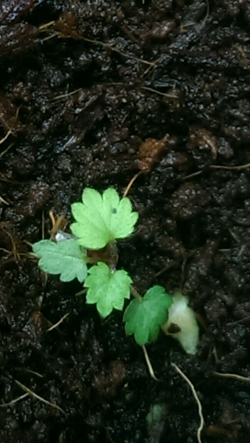 后来在运城买的赛娃草莓种子,出来的第一片真叶只有五个角,等待复叶的出现。