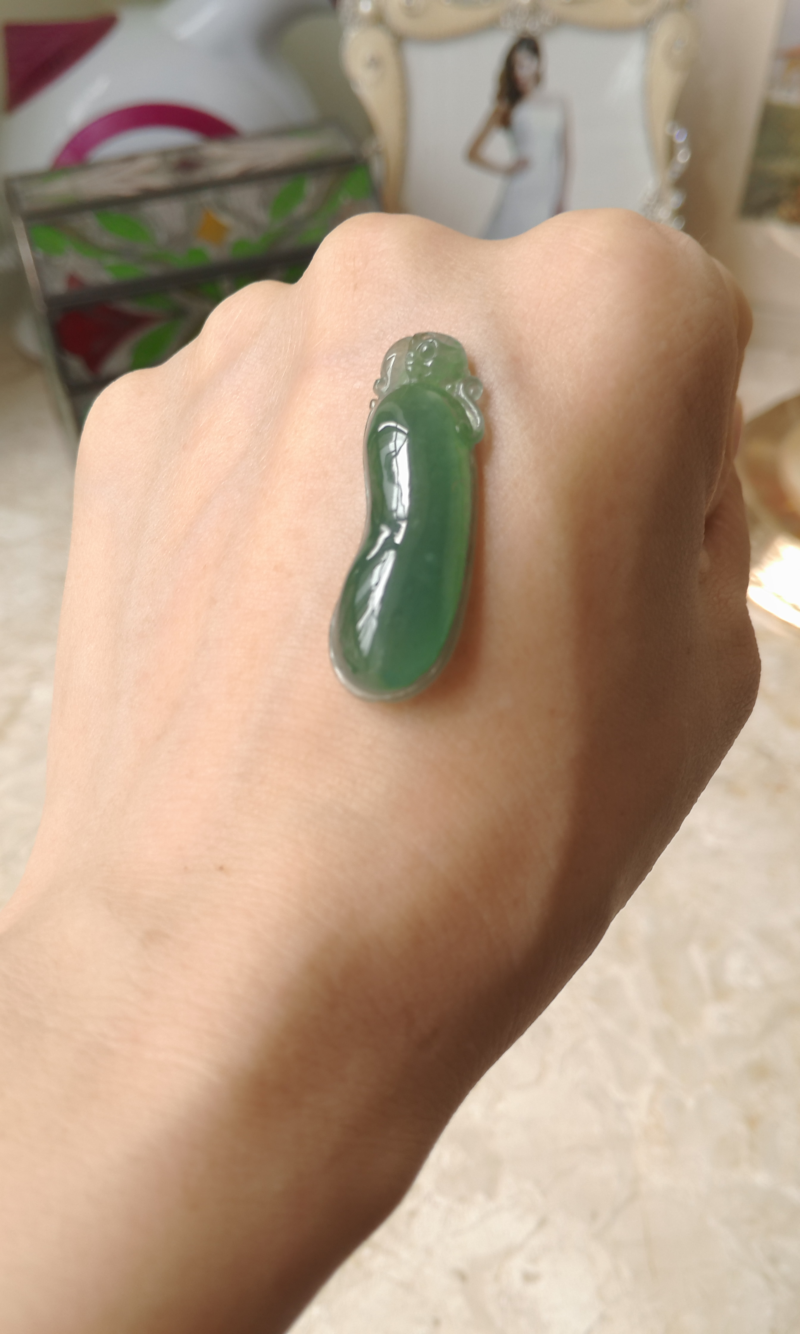 瓷度特别棒,就是高瓷啦!从照片反光度就可以看出来了。可以加个小扣子当锁骨链或是背云,纹特别美,每一面都像一幅油画一样,越看越有味道。